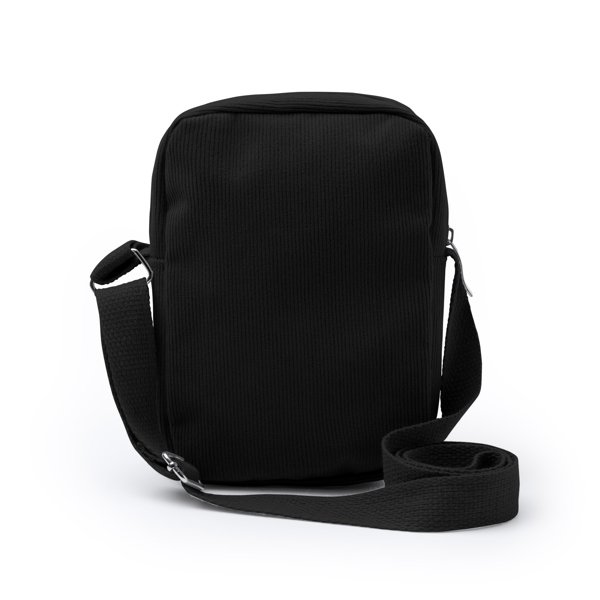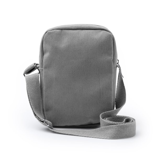 Shoulder bag made of corduroy fabric with zipper closure and matching adjustable strap.