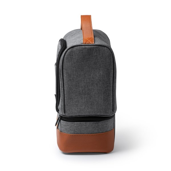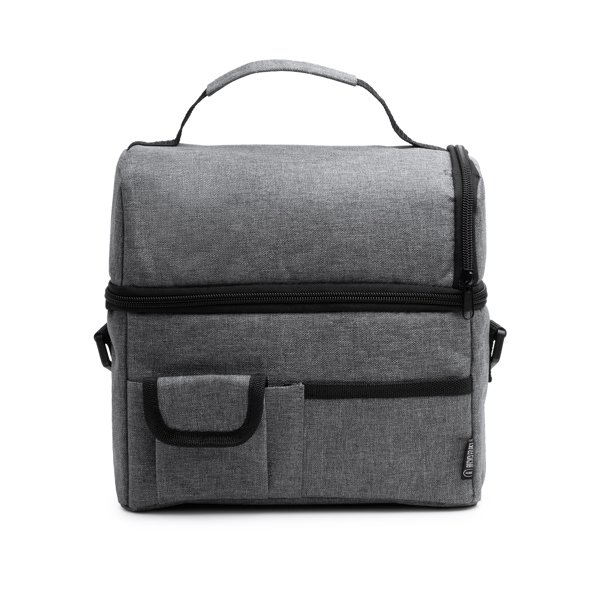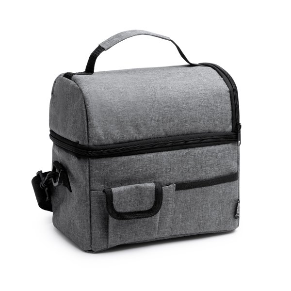 Cooler bag in heather design RPET polyester. Double independent compartments with zip fastening and isothermal lining. Carry handles and PU