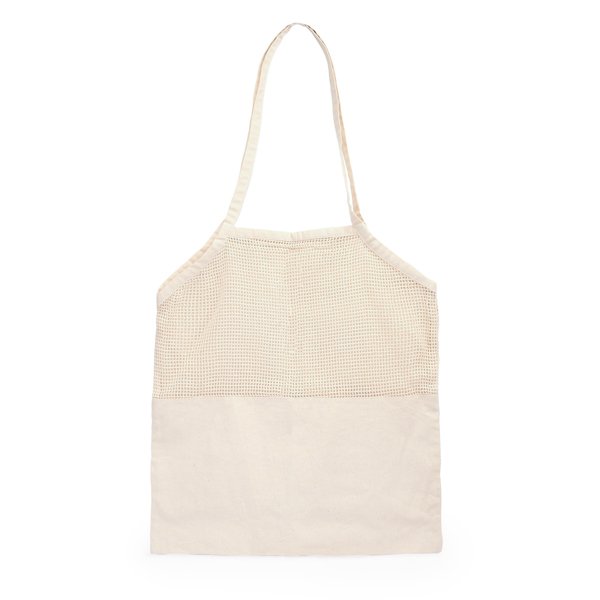 “Eco fruit bag made of 100% cotton in natural colour, with 60 cm long handles. 180 gsm. Half of the