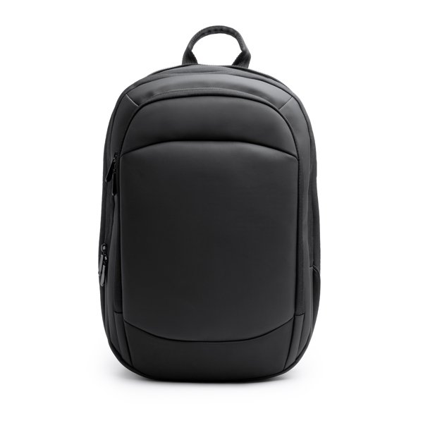 “PU Leather backpack with main compartment and pocket for 15″” laptop. Two front pockets with zip closure. Trolley strap. Padded