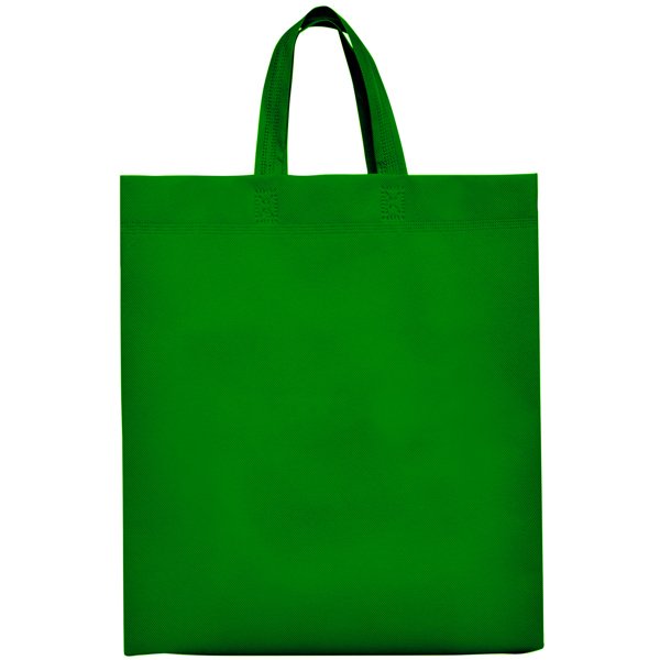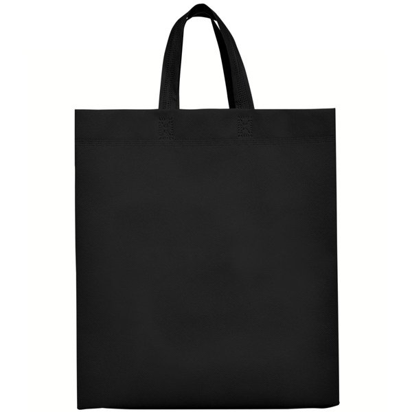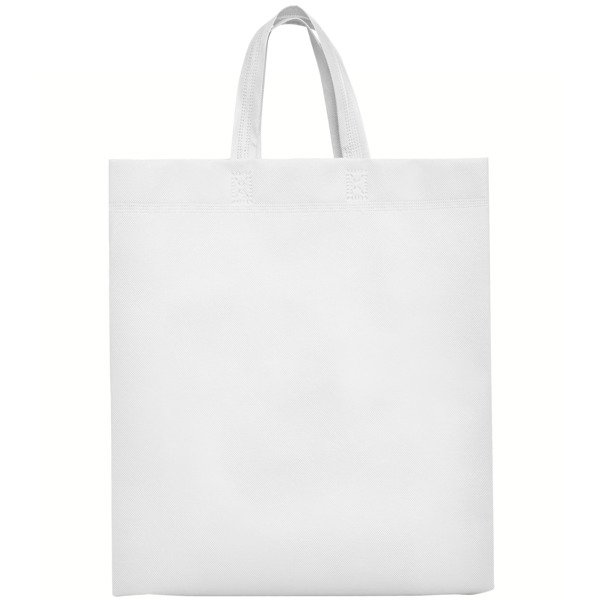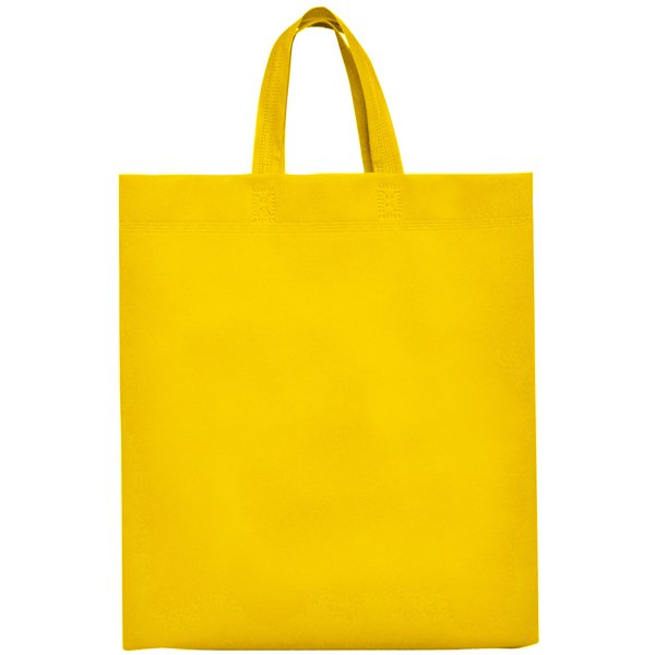 “Heat-sealed bag with gusset on the sides and base, and matching short handles, made of non-woven fabric.”