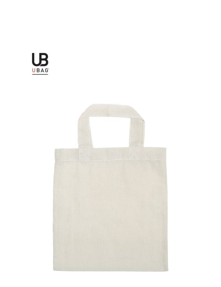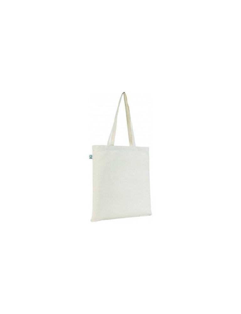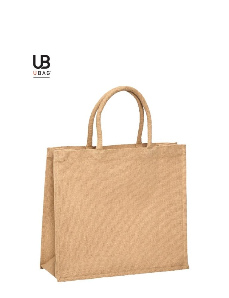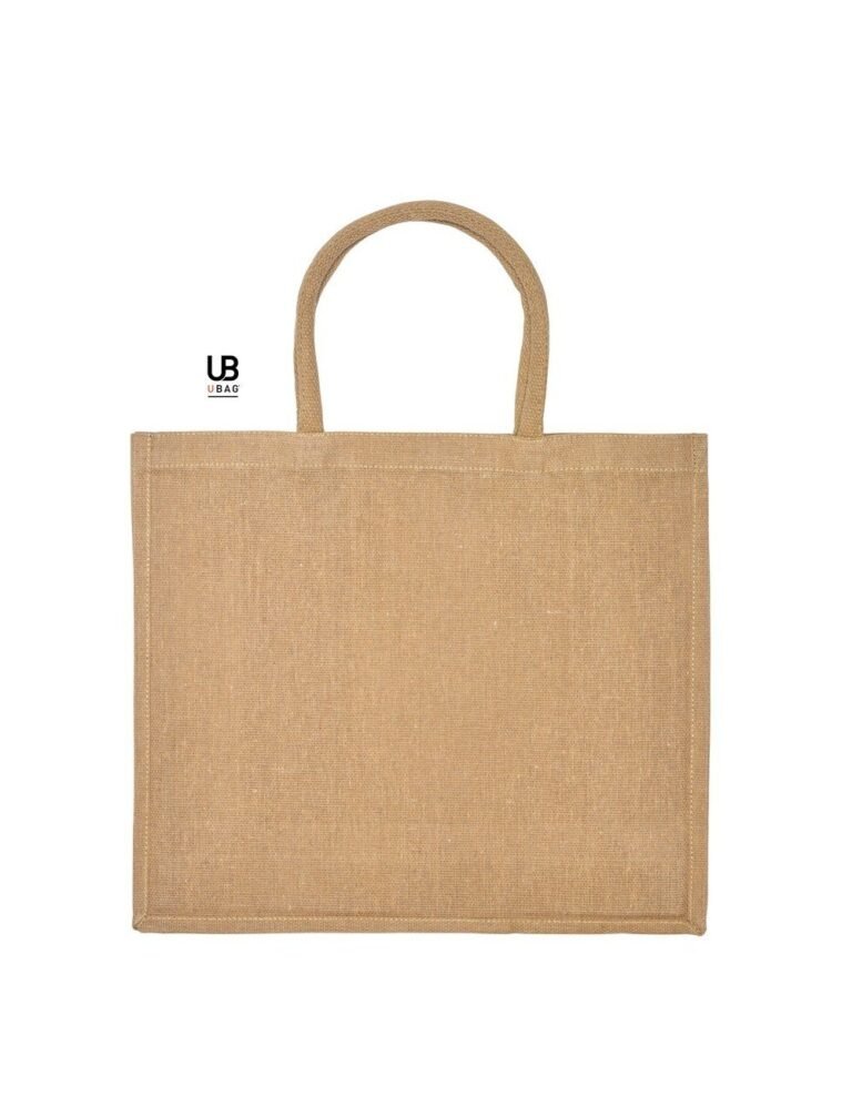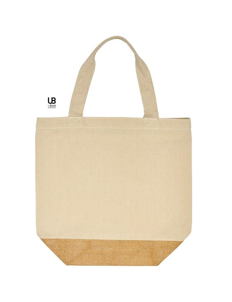 Bag in 330 gsm recycled cotton and natural yute. 70 cm long handles.
