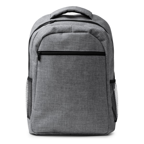 “Backpack made of 600D RPET with marbled finish. Padded handles and back. Large interior compartment and pocket for 15″” laptop.