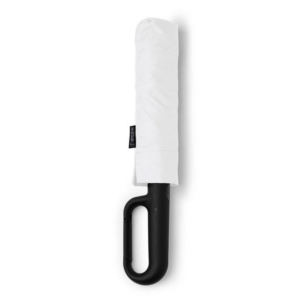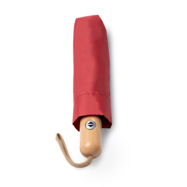 Foldable umbrella with auto opening-closing. 190T wind-proof pongee fabric with matching pouch. Bamboo handle and cotton strap. Presentation in eco