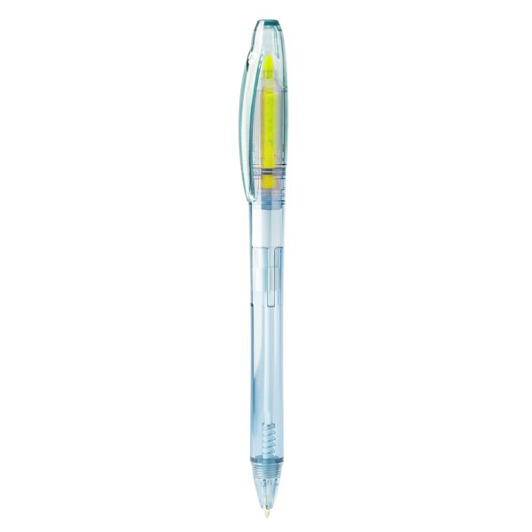 Pen/marker with blue transparent body and marker available in three fluor colours.
