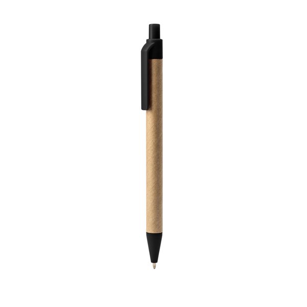 Spiral ring notebook with recycled cardboard hardcovers. Matching pen with blue ink included. 60 plain sheets.