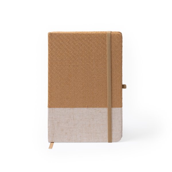 A5 notepad with hard covers in natural straw. Page marker and elastic band. 80 plain sheets.