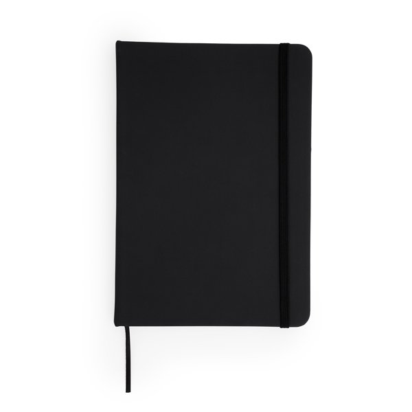 A5 notepad with rigid leatherette covers. Bookmark and elastic band. 100 sheets.