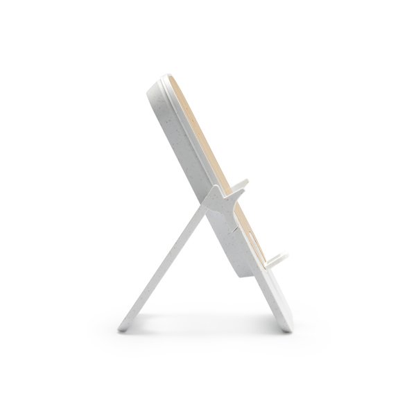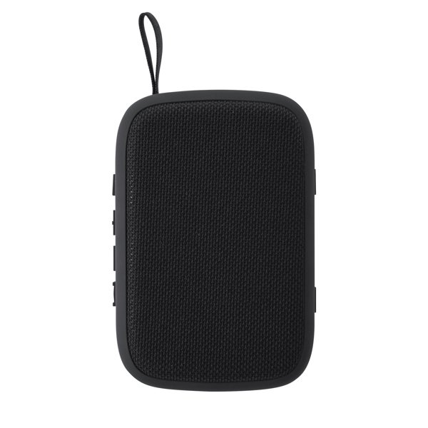 “Bluetooth wireless speaker with ABS body, bamboo front and visible membrane. Includes leatherette carrying handle. Power: 3W Rechargeable battery. Cable