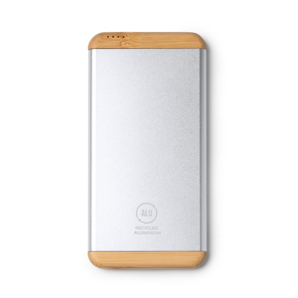 5.000 mAh power bank with structure made of recycled aluminium and bamboo. Type-C and DC5V/2A USB input and output. Cable