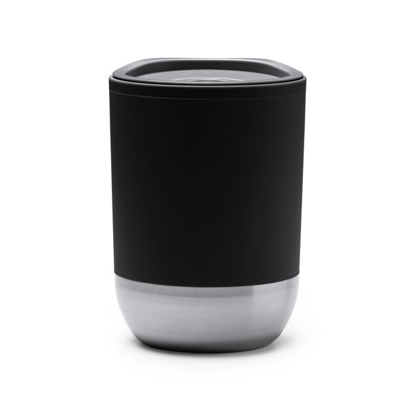 Double-walled cup with recycled PP body and 304 stainless steel base. Includes measuring lid. Capacity: 290 ml Presentation in eco