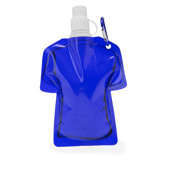 “Flexible RPET bottle designed in the shape of a t-shirt, with safety cap and carabiner for easy carrying. 470 ml