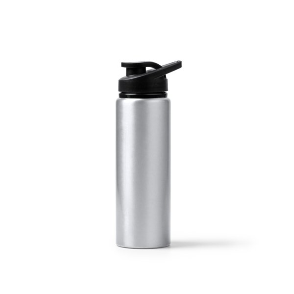 Recycled aluminium bottle with metallic finish. Lid with drinking spout and carry handle. Capacity: 800 ml. Presentation in eco design