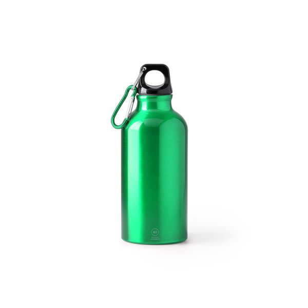 “Recycled aluminium bottle with single wall and matching carabiner. 400ml capacity. The carabiner is for carrying the bottle more comfortably,