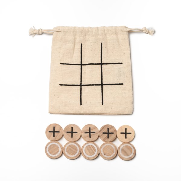 Wooden noughts and crosses game. Includes 10 pieces presented in a natural cotton pouch.