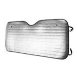 Rectangular car sun shield with aluminium front and white foam back. Two metal eyelets in both upper corners for suction cups. Black edging and elastic straps for folding. Suction cups included.