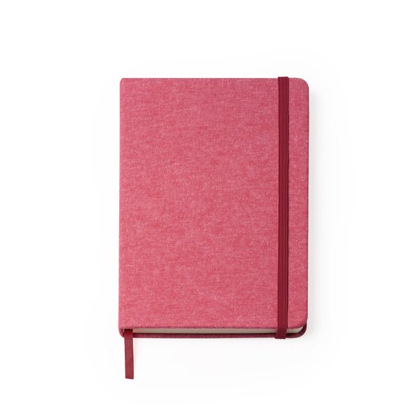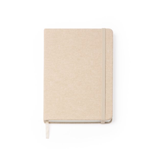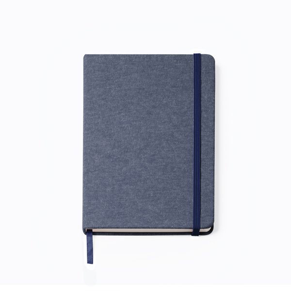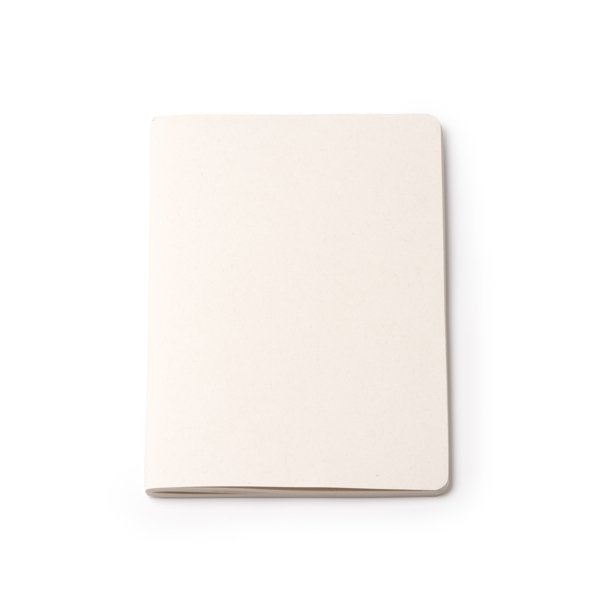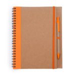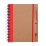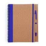 Spiral ring notebook with recycled cardboard hardcovers. Matching pen with blue ink included. 60 plain sheets.