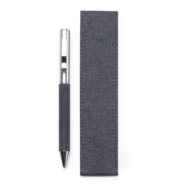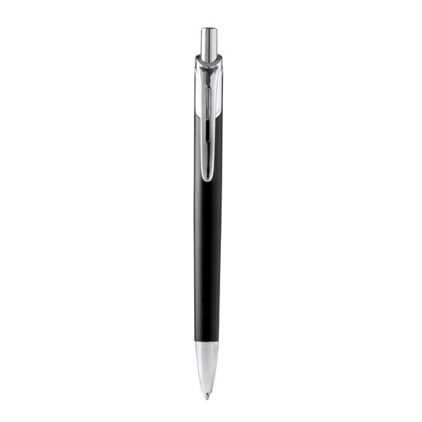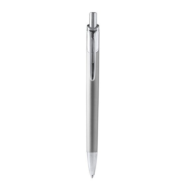 “Ball pen with LED flashlight, available in different metal finish colours and push button in black. In-built carabiner in cap. Blue ink refill.”