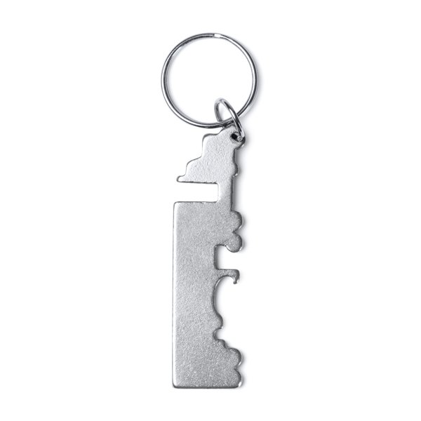 Bottle opener keychain in the form of a walkway made of recycled aluminium.