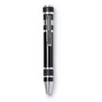 “Aluminium multi-tool in the shape of a pen. 8 screwdriver heads, star and flat, included.”