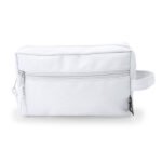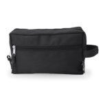 Toilet bag with two zip compartments and matching carry strap. Strap in puller and outer RPET logo label.