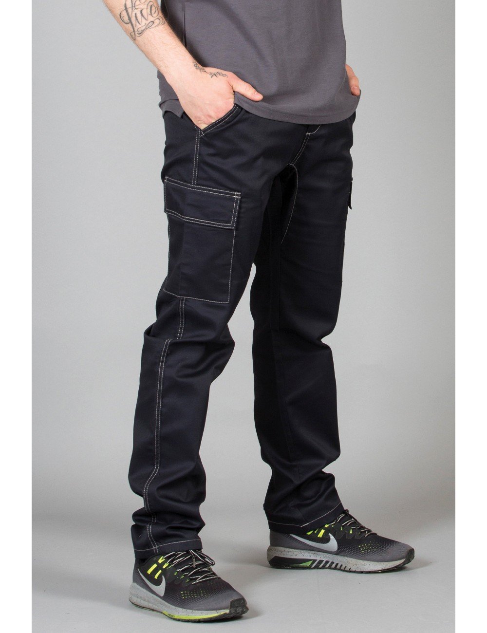Ραφές σε χρωματική αντίθεση – Ελαστική μέση – 2 ιταλικές τσέπες, 2 στο πλάι με velcro και 1 πίσω τσέπη με κουμπί
