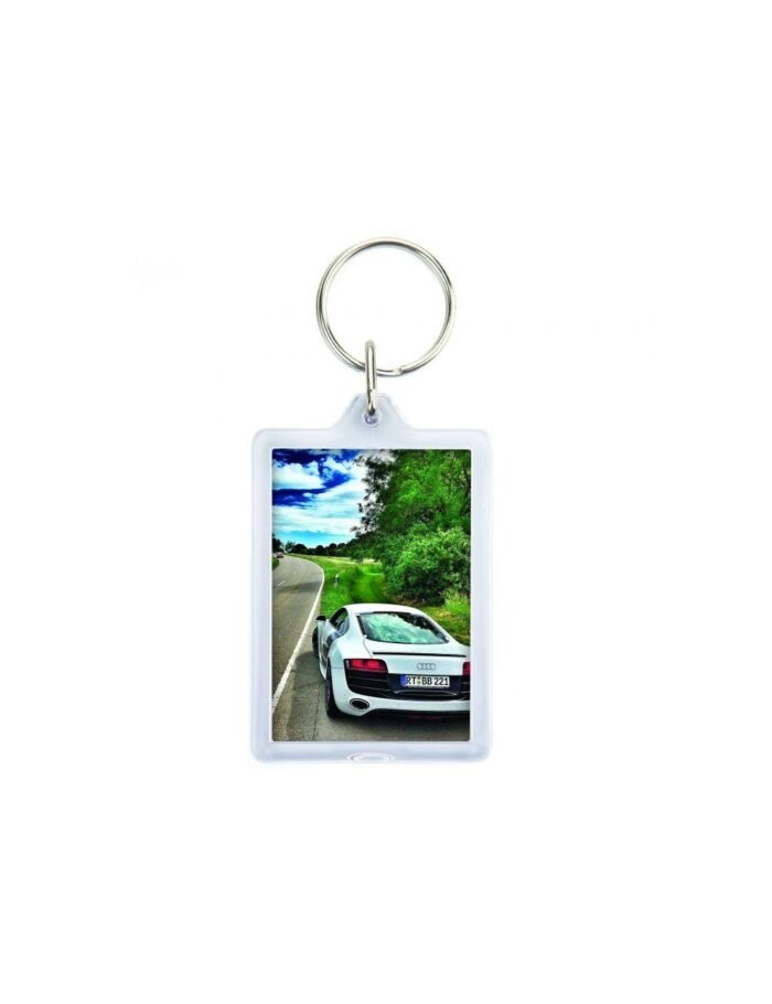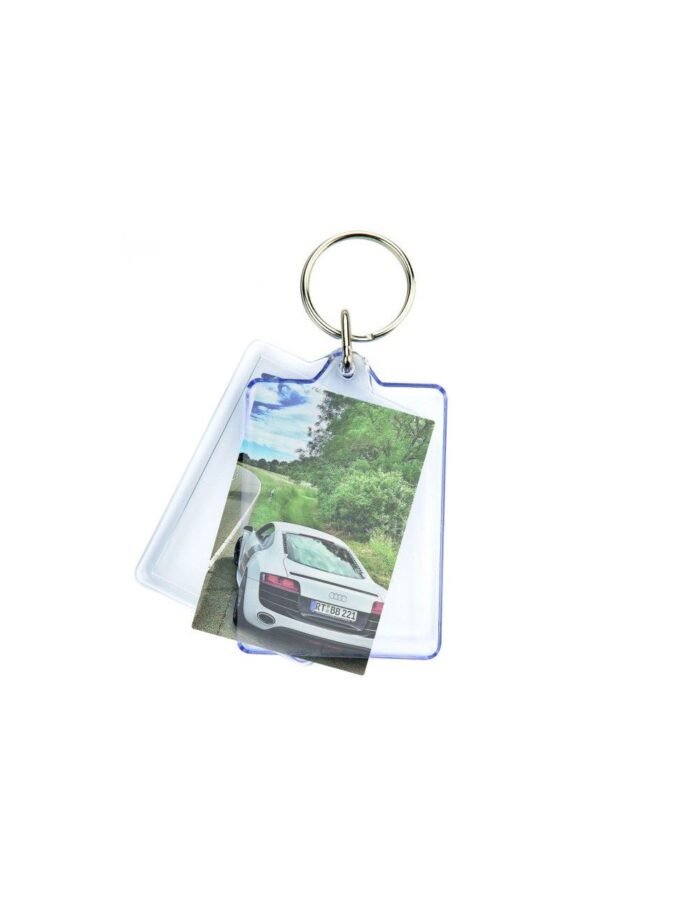 Μπρελόκ διαφανές ακρυλικό παραλληλόγραμμο, διπλής όψης. Δυνατότητα ανοίγματος μετά το κούμπωμα, για αλλαγή λογοτύπου.