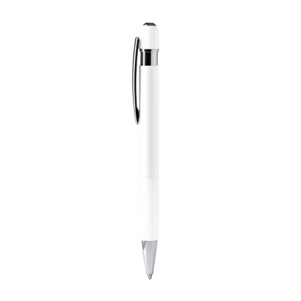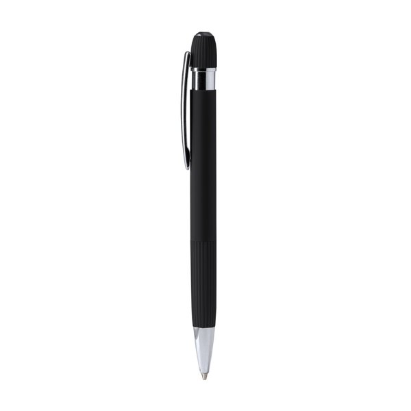 Pen with recycled aluminium body with striped grip and matte rubber touch finish. Details in chrome finish. Jumbo ink refill in blue.