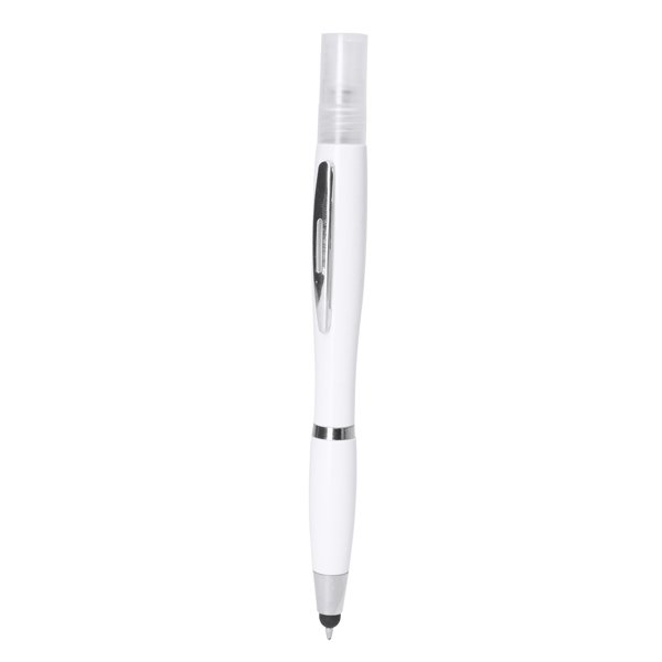 Antibacterial sprayer ballpen with rechargable spray and pointer. 3 ml capacity (liquid not included). Blue ink.