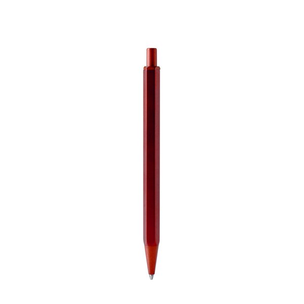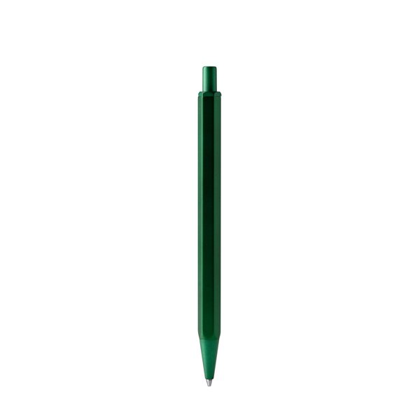 Hexagonal ball pen with metallic body. Blue ink jumbo refill.