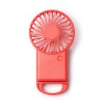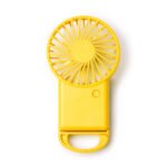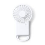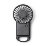 Handheld fan with carabiner and support function. Three speeds. Made of recycled ABS. Includes type-C cable. Presentation in eco design box.