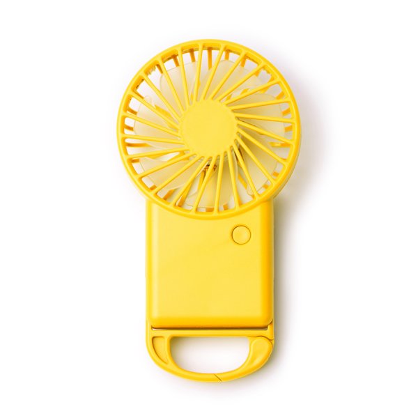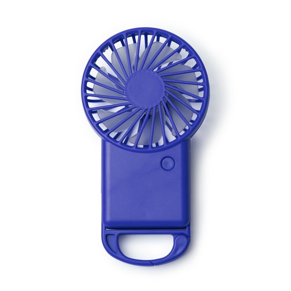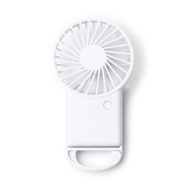Handheld fan with carabiner and support function. Three speeds. Made of recycled ABS. Includes type-C cable. Presentation in eco design box.