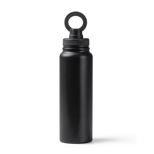 Double-walled thermal bottle in recycled 304 stainless steel with lid with magnetic ring for mobile phone holder. Non-slip rubber on the base. Capacity: 1L. Presentation in eco design box.