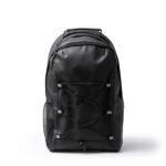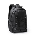 “Backpack made of PU leather with reflective details. Large capacity main compartment with interior pocket for 17″” laptop. Front with elastic cords and side pocket. Handles with adjuster. Padded back and handles. Capacity: XL”
