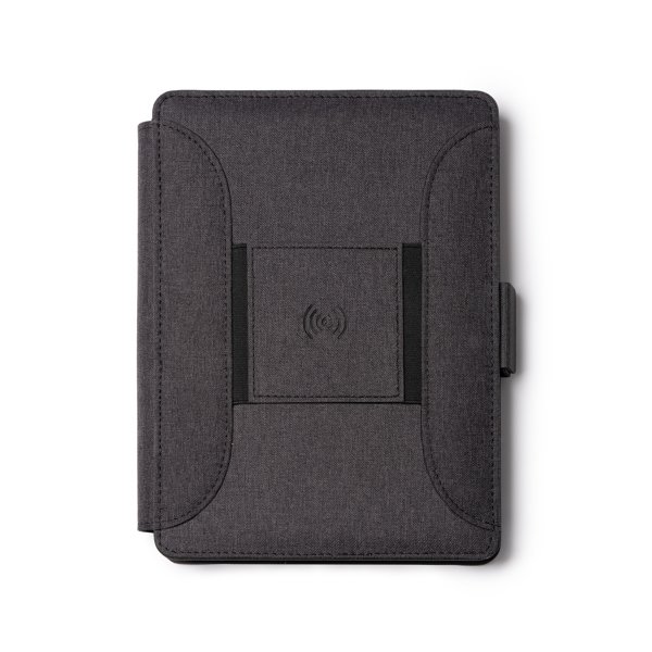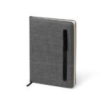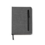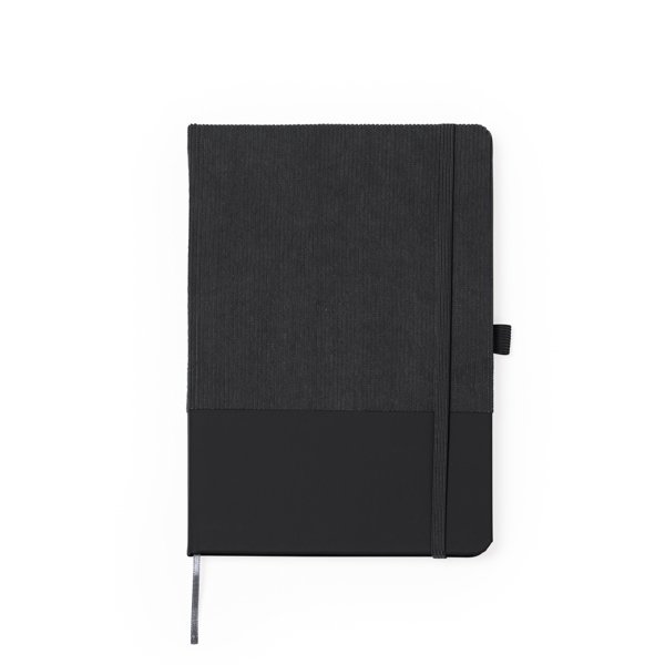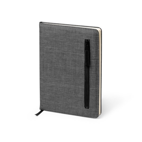 A5 notebook made in RPET. Outer pocket with zip closure. Includes bookmark. 80 sheets of lined paper.