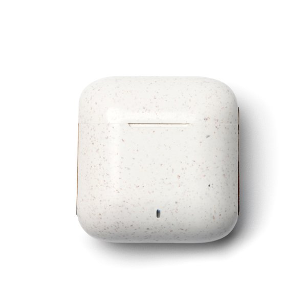 “Wireless earbuds in wheat fibre and bamboo, with charging case. In-built control panel with touch technology. Hands-free function. Rechargable battery. Type C cable included. “