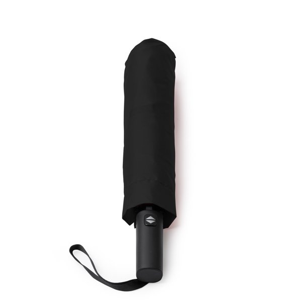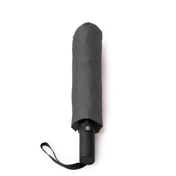 Foldable storm umbrella with auto opening and rubber handle. 190T pongee fabric with matching pouch. Black fiberglass ribs.