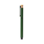 “Roller ballpoint pen with recycled aluminium body, metal clip and bamboo detail. Jumbo ink refill in blue.”