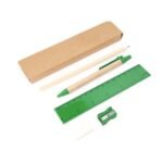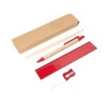 “5-piece set, including a ball pen with cardboard body and blue ink, a wooden pencil, a sharpener, a rubber and a 15 cm ruler.”