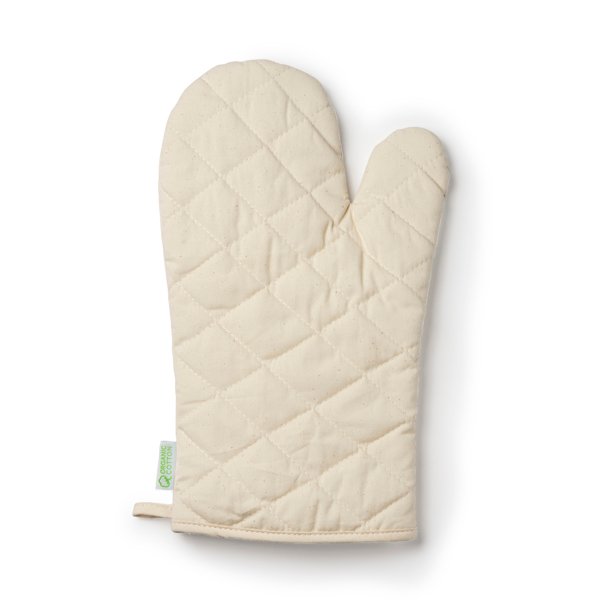 Eco kitchen mitt in 100% organic cotton with hanging strap and one flat side ideal for marking. Practical and comfortable for everyday use.
