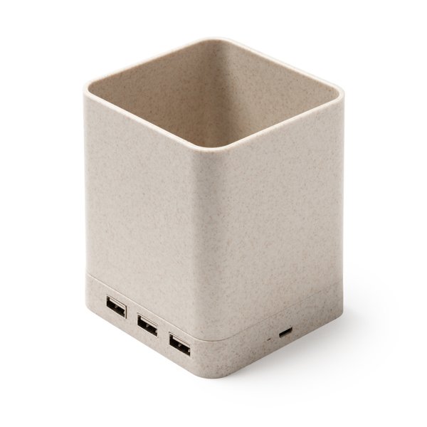 Multifunction pen made of wheat fiber with wireless charger with 5W power and three USB ports. Includes Smartphone holder and micro USB cable.