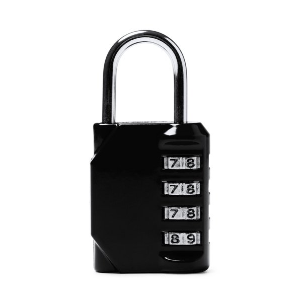 A padlock with a 4-digit combination. Stainless steel body and handle.