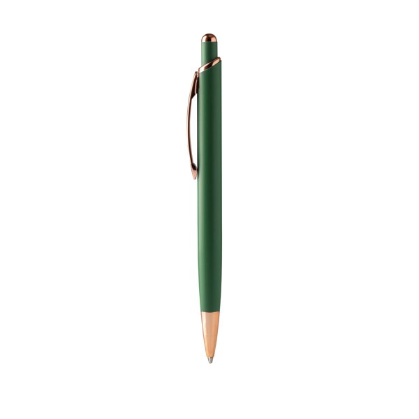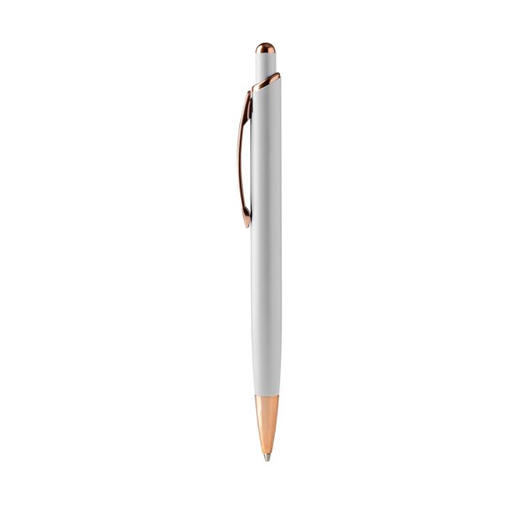 Push ball pen with matt metal structure with copper finish details. Blue ink jumbo refill.