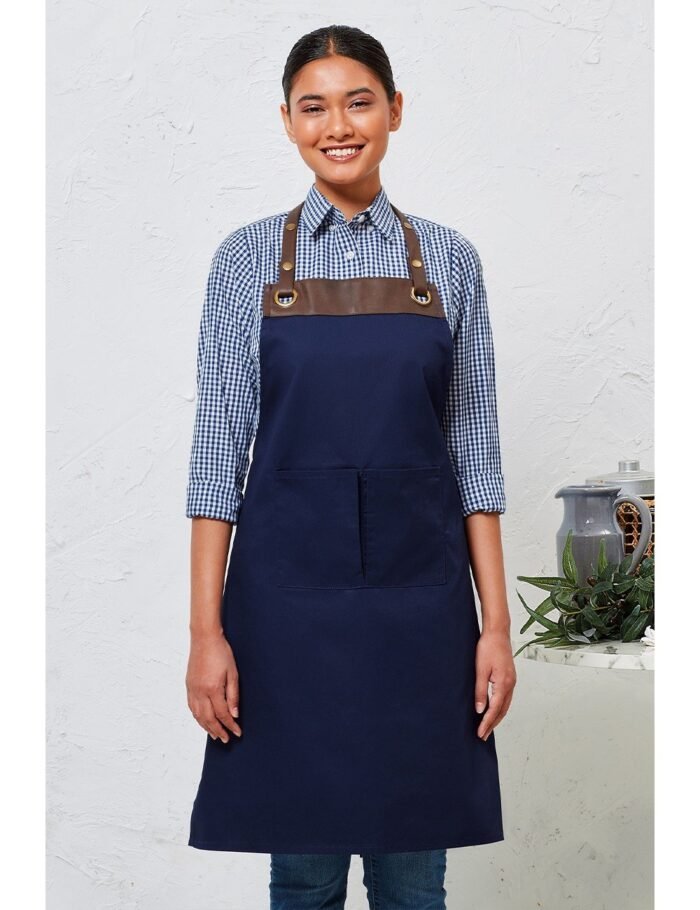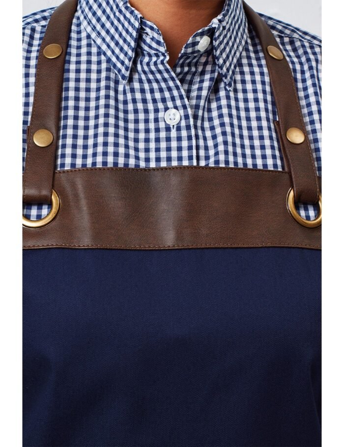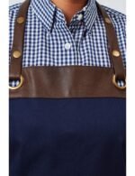 Ολόσωμη μακριά ποδιά έως το γόνατο – Λαιμόκοψη και πάνω μέρος από δερματίνη – Ρυθμιζόμενη στο λαιμό με κουμπιά – Τσέπη (25×16,5εκ.) με πιέτα και 2 χωρίσματα