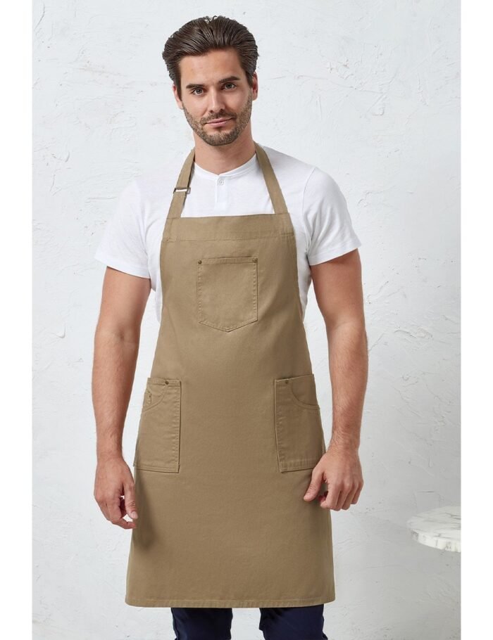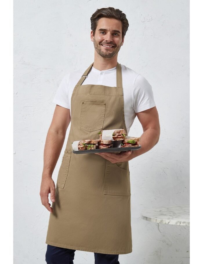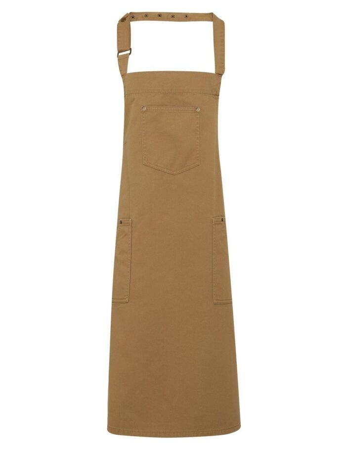 Ολόσωμη μακριά ποδιά έως το γόνατο – 1 κεντρική πάνω τσέπη (13×16εκ.) και 2 από κάτω (18×20εκ.) με λεπτομέρειες με τρουκς – Ρυθμιζόμενη στο λαιμό με μεταλλική πόρπη και κλείσιμο με κουμπί