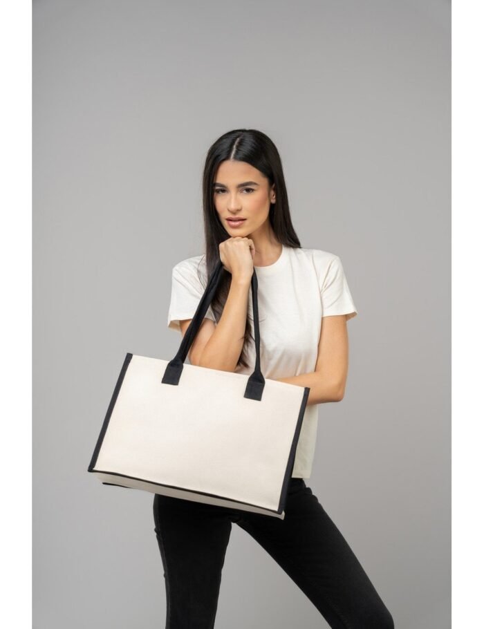 Κοντά, στρογγυλά χερούλια σε χρωματική αντίθεση – Χρωματικές λεπτομέρειες περιμετρικά – Αφαιρούμενος σκληρός πάτος – Με πιέτα