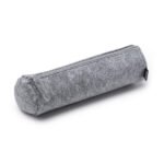 Recycled felt cylindrical case with a zipper closure and matching zipper pull.