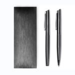 “Elegant twist roller pen and propelling pencil set, in a dark steel design. Presentation in a padded leather case with inner lining. “