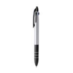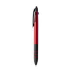 “Retractable 3-ink ball pen. Body in ABS with details in black and soft grip. Touch pointer. Blue, black and red ink. “