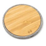 “Wireless charger with main structure in bamboo and RPET fabric, compatible with wireless technology devices. 10W output. Type C connection. Cable included. Presentation in eco design box.”
